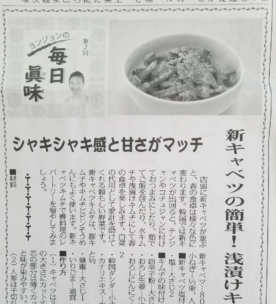韓国民団新聞『統一日報』『ヨンジョンの毎日眞味』コーナーで『キャベツキムチ』を紹介しています。